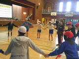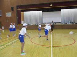 各小学校の児童が混合チームをつくり、アイスブレイクで緊張をほぐしたあと、ドッジボールのゲームに取り組みました。活動が進むにつれて徐々に笑顔が増え、初めて会う友だちとも協力し合いながらゲームを楽しむ姿が見られました。互いに関わり合いながら、交流を図ることができました。