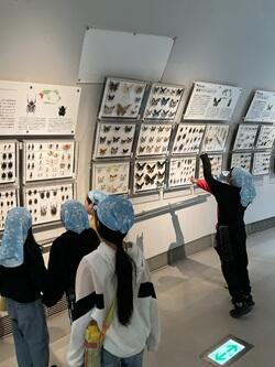 大きなガラスドームの「昆虫観察館」では、鮮やかなチョウが頭上を舞う幻想的な光景に、「わあ、すごいね!」と感動する声が響きました。普段は図鑑でしか見られない珍しい昆虫たちの生態を知るため、熱心に観察し、友達同士で知識を深め合うことができました。