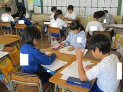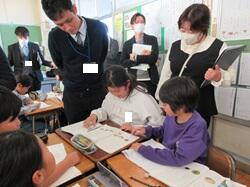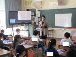 3年生の子どもたちは、説明文「すがたをかえる大豆」を題材に、中心となる文や大豆の食べ方の「くふう」に着目しながら、段落の順序の意味について考えを深めていました。ユニットで意見を交流し合ったり、先生との対話をし合ったりして、互いの考えをつなげていく子どもたちの姿があり、指導者の先生から、「言語能力を高める授業であった」とお褒めの言葉をいただきました。