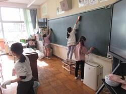 1年生は、4月から使ってきた教室や廊下の大掃除を行っていました。ほうきを使う人、雑巾がけをする人、黒板をきれいにする人など、それぞれが役割を意識し、助け合いながら一生懸命取り組む姿が見られました。