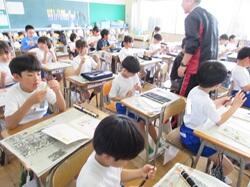 また、3年生は書写の学習を行いました。今年度から始まる「毛筆」に向けて、用具の名前を確かめたり、筆の穂先をやさしくほぐしたりと、基本となる準備を進めていました。初めての活動に、意欲的に取り組む様子が見られました。