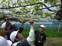 今回の体験では、「ぼんてん」という道具を使い、花粉をめしべにつける作業を行いました。子どもたちは、説明をよく聞きながら、一つ一つ丁寧に取り組み、わからないことは地域の方に伺いながら活動する姿が見られました。地域の方に、「おいしい梨の見分け方」「梨の収穫がないときにする作業」についてなど、たくさんの質問をしていました。
