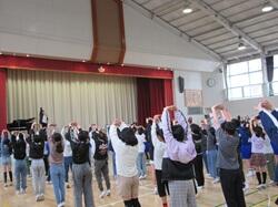 はじめに、「歌声の体操」で発声練習を行い、音楽担当の先生から声の出し方を教えていただきながら、楽しく取り組みました。